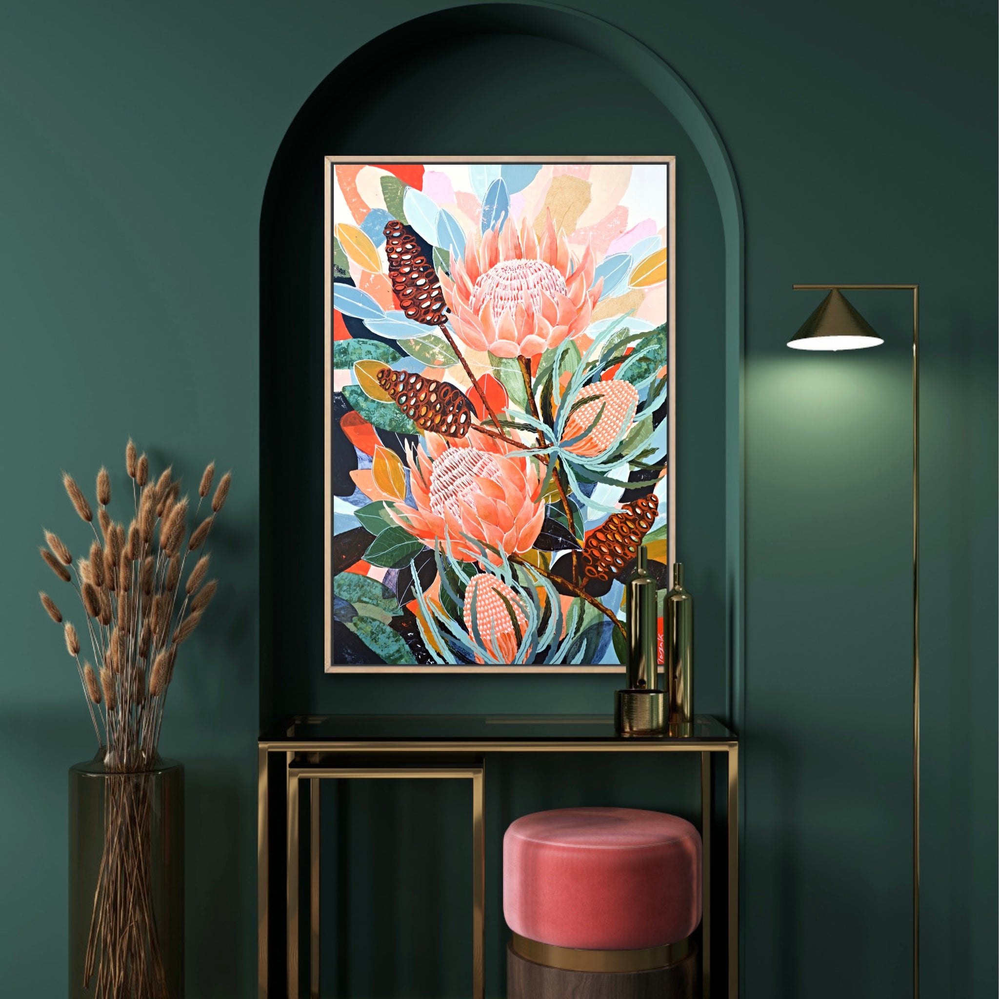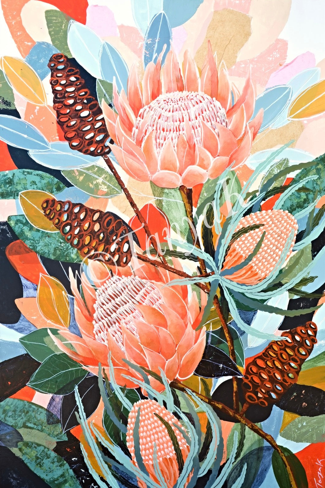 This is such a whimsical Piece that has truly captured my heart. It’s layered with so many colours, textures and shapes and really brings the attention as much to the background as the floral elements. It’s everything I love in an artwork, and a piece that reflects a wandering mind and wonderful outcome!